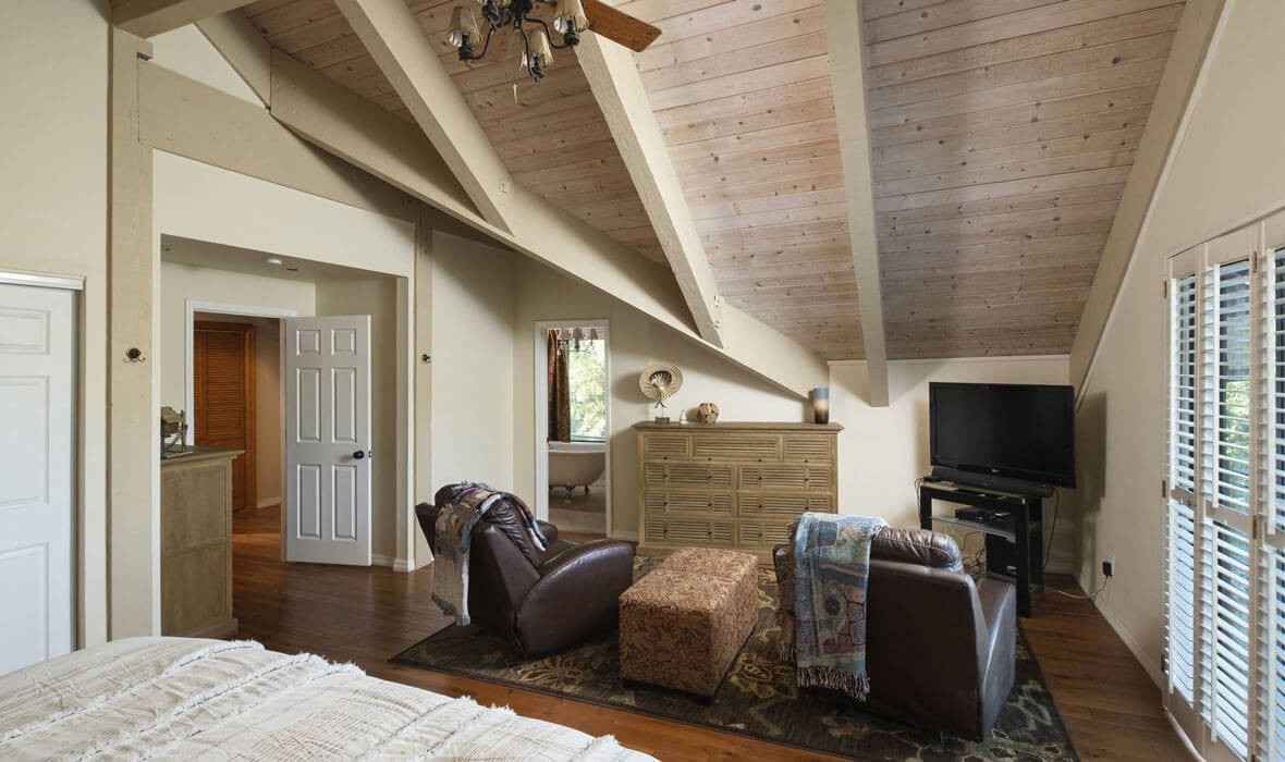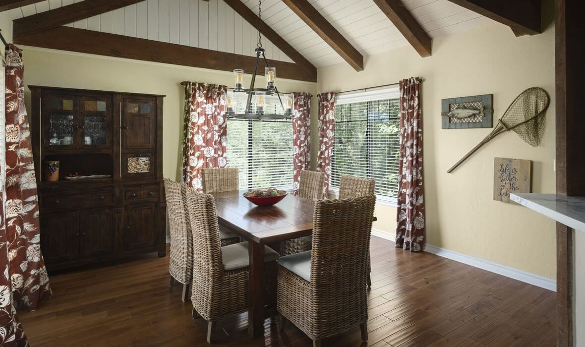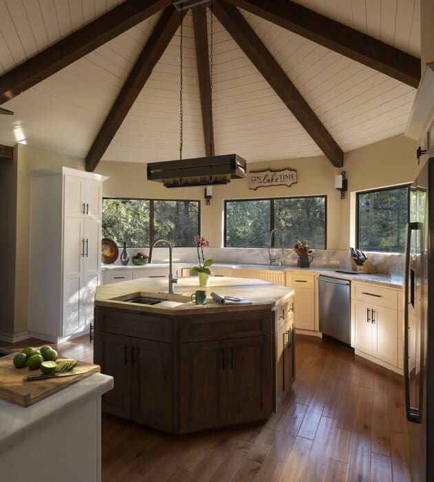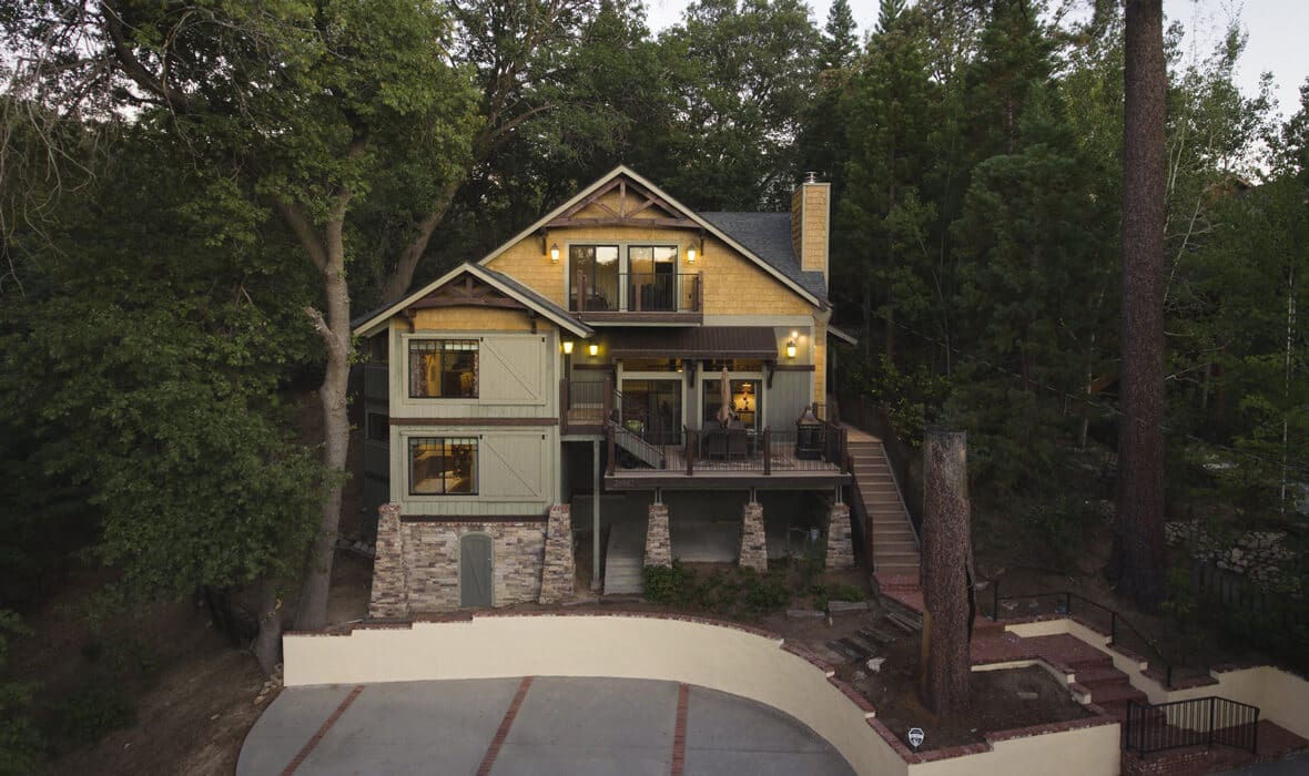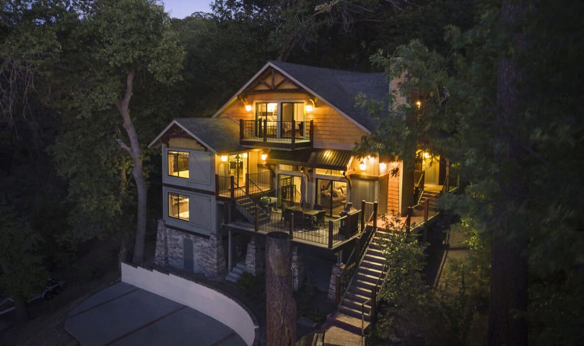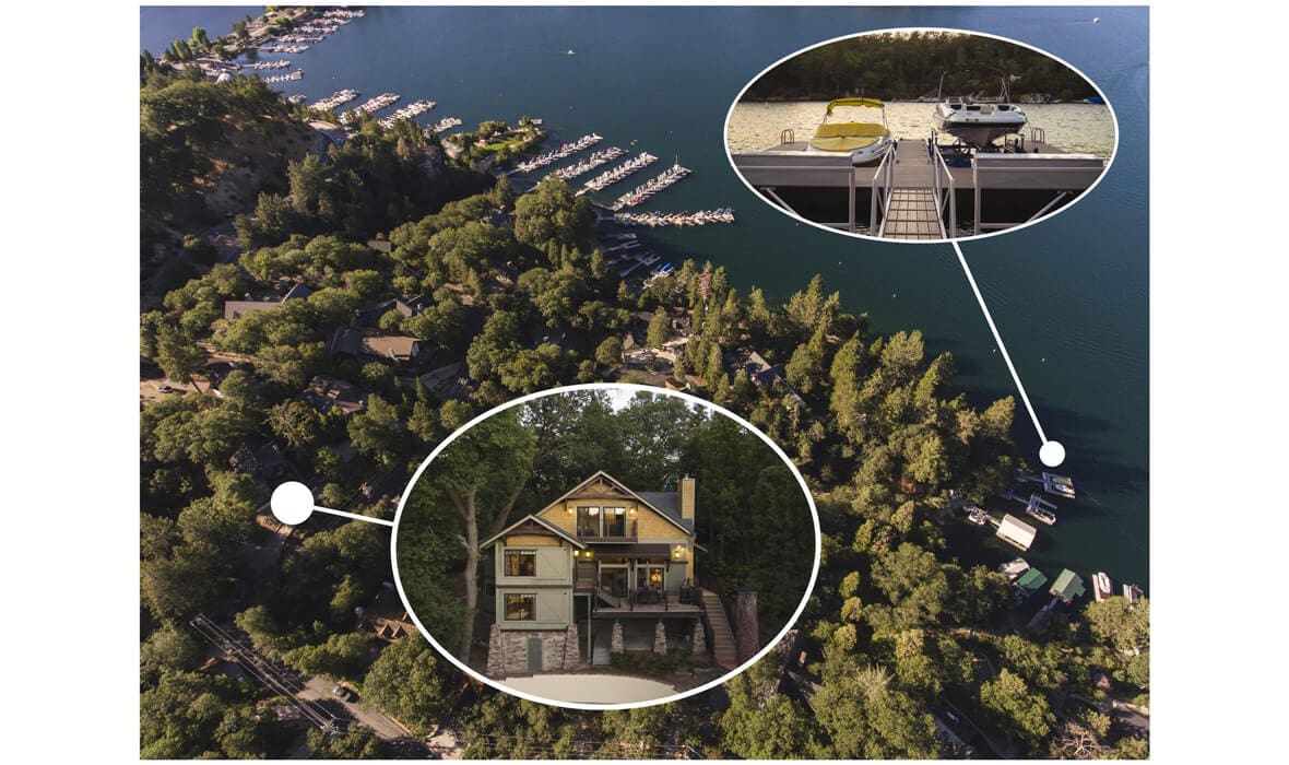 First Tier Dream Retreat in the gated and lakeside community of North Shore Estates. This craftsman-style lake house offers modern luxury in a picturesque locale. A tremendous Value in this Coveted Community! Just a short stroll to your half double dock located at the top of Winter Harbor (available for additional purchase). The dock is in the perfect location to watch the 4th of July fireworks. The heart of the home is the newly remodeled kitchen with a stunning octagonal butcher block island. Stainless steel appliances and quartzite countertops grace the kitchen, while (engineered) hardwood flooring adds sophistication throughout. The charming residence features three guest suites, one with a separate walk-in shower and spa tub, plus a convenient office or fourth bedroom. The master suite is a true oasis with a private viewing deck and a spacious bath boasting a walk-in shower and clawfoot tub. The beamed and vaulted ceilings pair with extensive use of windows to capture mountain wildlife and tree views. Plantation shutters, air conditioning, and a full house generator provide comfort and convenience. For cozy evenings, gather around the massive wall-to-wall, floor-to-ceiling fireplace with its stunning log-style mantle in the sunken living room. Ample parking ensures you, your guests and your boat have space out of the way. Don’t miss the opportunity to make this lakeside retreat in sought after North Shore Estates your own. Contact us now to discover the serenity of life in this knitted community. Your dream lake house awaits in Lake Arrowhead, CA.